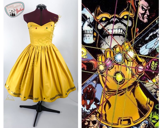 A mannequin dressed in a yellow dress with a floral pattern and a yellow belt stands next to a comic book page featuring the Avengers, with a prominent image of the Hulk's hand holding a glowing Infinity Stone. | Thanos Disney Bound | 0bffa81ed2a05380942318d28ef380a4286baae794d236456a2786d02426112a | 000720954383 | 0 | 0 | 38 | 3 | 0 | 0 | |