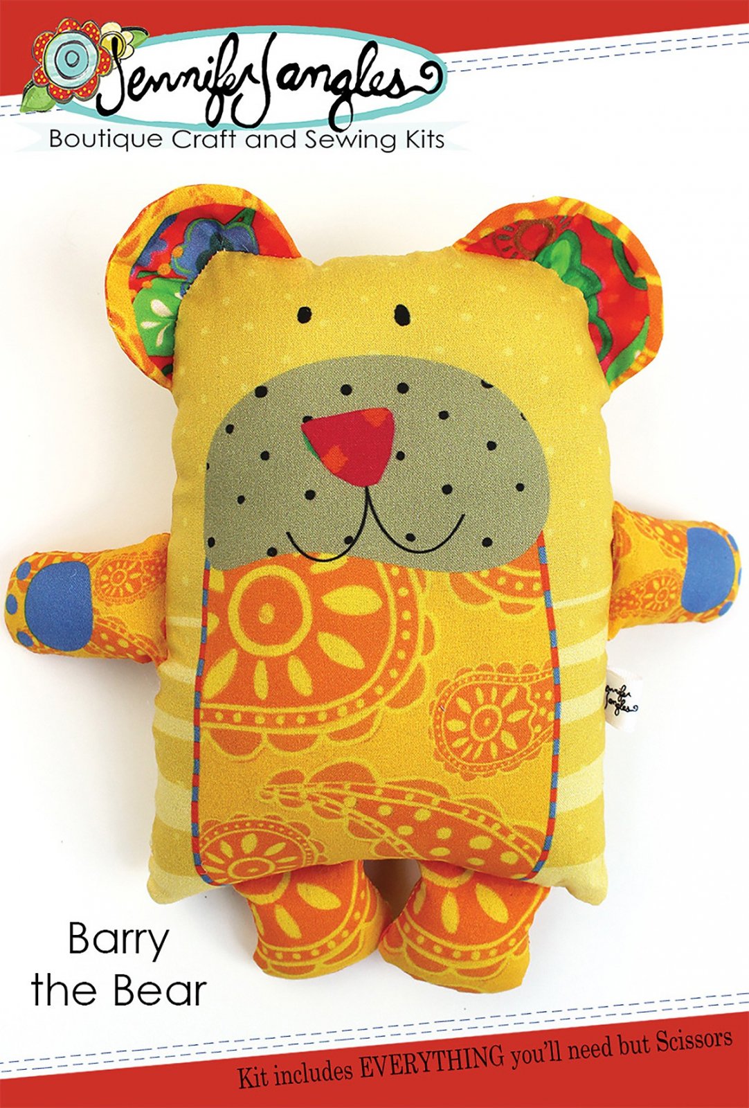 A plush toy with a bear's head and body, featuring a yellow and orange color scheme with a pattern of black spots and a red nose. The bear has a blue bow tie and is wearing a patterned orange and yellow outfit with a sun and flower design. The toy is part of a craft kit by JenniFur Jangles, which includes everything you'll need but scissors. | Barry the Bear Sewing Kit | f44d1a336ff199621b348bf5d4a7cfcf6ddc3f6fdc01b334f4951b4f60249ecb | 000720954599 | 0 | 0 | 66 | 5 | 0 | 0 | |