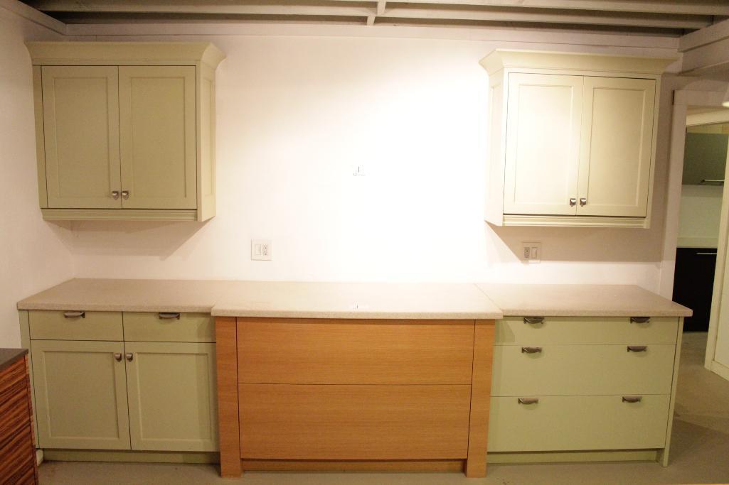 A kitchen with light green cabinets and a wooden countertop. The cabinets are closed, and there is a single light switch on the wall. The room is well-lit with natural light coming from the left side, and there is a visible ceiling with wooden beams. | Lot 1 - Display Kitchen cabinets | 28cac6cb6ed8202a7f2ece160bc36ac258d0cf3b14d40d88d45e1c1df0cd4184 | 000720954617 | 0 | 0 | 45 | 6 | 0 | 0 | |