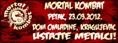 A red poster with a distressed, blood-like texture and the words 'MORTAL KOMBAT' in large, bold letters at the top. Below the title, there is a date '30.03.2012' and the word 'PETAK' in a smaller font. The poster also features the names 'DOM OMLADINE', 'KRAJUGA', and 'KRAGUJEVAC' in a row, followed by the word 'USTASTE' and 'METALCIL' in a larger font. The background is a red and black gradient with a skull-like design at the top left | Mortal Kombat @ Dom omladine, Kragujevac | a74c9a718c0f17d31fdfd57ee9dcc140a4ec8fb5c83916a335054c0b17291426 | 000720954652 | 0 | 0 | 77 | 6 | 0 | 0 | |