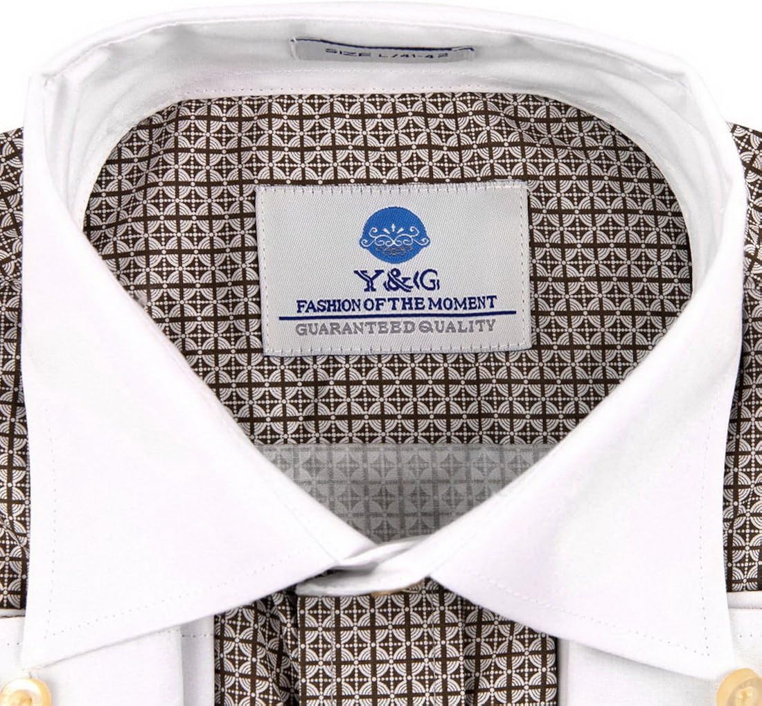 A white dress shirt with a brown patterned collar and cuffs is displayed. The shirt has a buttoned placket and a tag with the text 'Y&G FASHION OF THE MOMENT GUARANTEED QUALITY' on the collar. | Y/&G YMA01B Multi Checkered Dress Shirt for Husband Cotton Cuff Shirt | 19803d7006d6c581a6bd90f9a0e0f4b11eb957cd06c0c1cff0d093df74f5447d | 000720954760 | 0 | 0 | 35 | 11 | 0 | 0 | |
