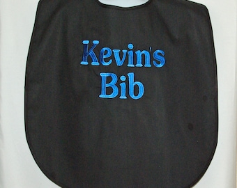 A black bib with the name 'Kevin's Bib' embroidered in blue thread. The bib has a shiny, smooth surface and is placed against a white background. | Extra Large, Custom Funny Adult Bib, Canvas, Clothing Cover Up Protector, No Shipping Fee, Ready To Ship TODAY AGFT 507 | f93d2f4ab169bcd7282bb0e0575d605a75575ac4d4c5ab0109fccabb77b1cc4a | 000720954785 | 0 | 0 | 26 | 20 | 0 | 0 | |