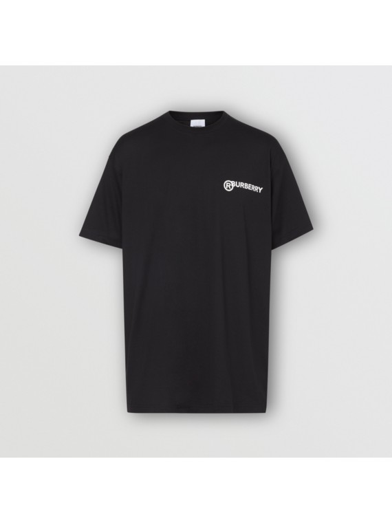 A black t-shirt with a white logo on the front is displayed against a white background. The t-shirt has a round neckline and a straight hem. The logo features the word 'BURBERRY' in white capital letters with a small crown symbol above it. The t-shirt appears to be a standard size, and the fabric has a smooth texture. | Logo Print Cotton Oversized T-shirt in Black | 63f73de9530c6c8c0d78382ede500d61be87aa04600684f5b15be0d837c02b0e | 000720955954 | 0 | 0 | 58 | 7 | 0 | 0 | |