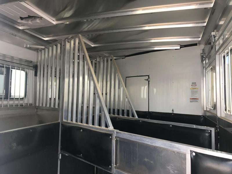 The first image shows the interior of a horse stable with a metal railing and a metal gate. The stable is empty, with no horses present. The walls are white, and there is a metal roof with visible rivets. The floor appears to be made of concrete, and there is a small window on the left side of the stable. | 2017 Sundowner Horizon 8010 3H LQ Horse Trailer | cc4962c30105ae53cd7999ca893684dbcac40f6b543f0c9629b2b107e0930ae7 | 000720956041 | 0 | 0 | 60 | 8 | 0 | 0 | |