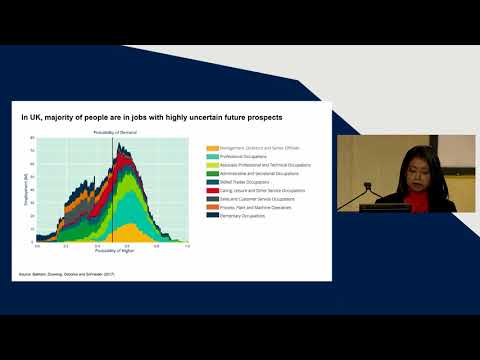 A graph showing the distribution of job prospects in the UK is displayed on a screen. The graph is divided into sections representing different job prospects, with the left side showing low prospects and the right side showing high prospects. The graph is overlaid with a quote that reads 'In the UK, many people are with highly uncertain job prospects.' Below the graph, there is a person standing in front of a whiteboard, seemingly presenting the information. | Future of skills and employment, and student choice | d170f27ca4ef73190cb5eaa5d1a0e233e0b9203e5f2f4a98cc3afef5f30a7ef9 | 000720956305 | 0 | 0 | 77 | 8 | 0 | 0 | |