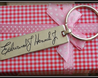 A silver key with a personalized tag that reads 'EDWARD J. HENRILM' is attached to a red and white checkered ribbon. The key is placed on top of a red and white checkered box. | Signature Keychain. Memorial Keychain. Handwriting Keychain. Memorial Jewelry. Your loved ones Handwriting. Sterling Silver | c89a3b63888ad37c6c920ac3839080717fea778cd294ec69826a3a71d54f4793 | 000720956304 | 0 | 0 | 34 | 14 | 0 | 0 | |