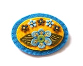 A close-up image of a blue embroidered patch with a yellow border and a yellow center. The patch features a blue flower with a yellow center, surrounded by smaller blue flowers and yellow petals. The background is a plain white surface. | Sweetheart felt brooch pin with freeform embroidery | 74c0bbac762160cbb6af054023c958f181fd1623640ff671368fc2a60aca7009 | 000720956163 | 0 | 0 | 41 | 7 | 0 | 0 | |