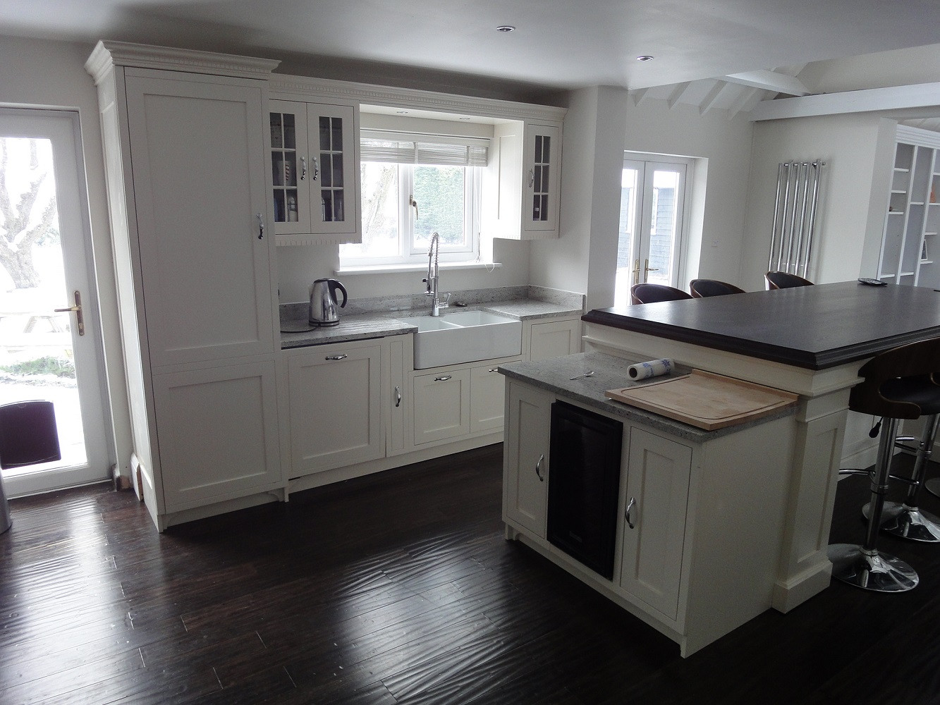 A spacious kitchen with white cabinetry, a central island with a wooden countertop, and a sink with a window above it. The kitchen has dark hardwood flooring, and there is a refrigerator on the left side. The room is well-lit with natural light coming from the windows. | hand painted american shaker style kitchen | 0bdcf49ab06755c5cfba7f9106222a43e854a59fdf3cb27187104907606097dd | 000720956265 | 0 | 0 | 47 | 6 | 0 | 0 | |