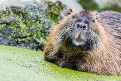 A close-up of a beaver's face with its mouth open, showing its teeth and tongue. The beaver is sitting on a moss-covered rock, and its fur appears wet and matted. The background is out of focus, with hints of greenery and a dark, possibly rocky, surface. | Myocastor coypus, single mammal Stock Photos | 7203f620ad841617e525267fb638970ca777645cf44ed687315664cd71731ff6 | 000720957133 | 0 | 0 | 46 | 6 | 0 | 0 | |