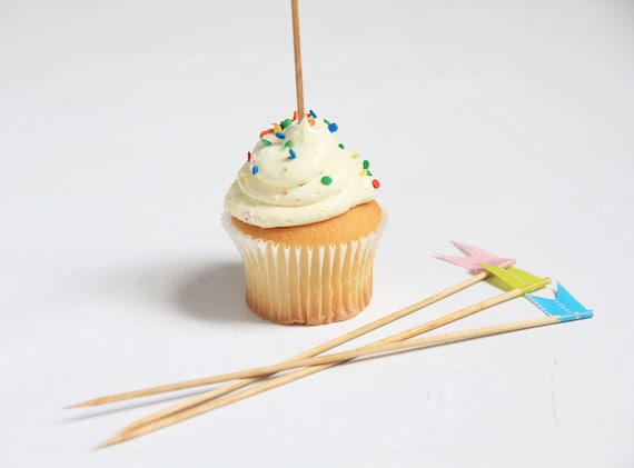 A single vanilla cupcake with white frosting and colorful sprinkles is placed on a white surface. The cupcake is on a wooden stick, and there are two wooden skewers with blue and yellow decorations lying next to it. | Cupcake Toppers - Cake Toppers - Wooden with Japanese Washi Tape Flags - Set of 12 | fd3e75dca5dfba87109a2009eb8e0b19276afb498490a7b21a984f7abde0e8ad | 000720957292 | 0 | 0 | 38 | 16 | 0 | 0 | |
