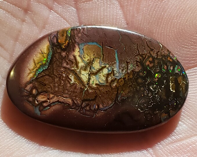 A close-up image of a hand holding a brown and black stone with a glossy surface. The stone has a pattern of gold and blue iridescent colors, and it appears to be reflecting light. The hand is positioned in such a way that the stone is held between the thumb and index finger, with the other fingers supporting it from below. | 46 Ct. Boulder Opal - Koroit, Australia - 37 X 22 mm | 91e5ebdef1ae832bd66c666457a34916e7c778afd1dc46b768e5188bf8cb7b9a | 000720957026 | 0 | 0 | 61 | 12 | 0 | 0 | |