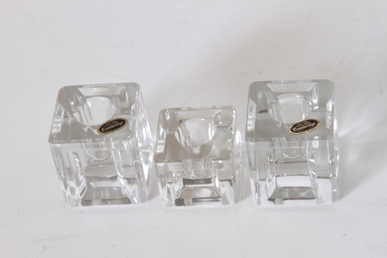 Three transparent glass coasters with a circular gold emblem in the center are arranged in a row on a white surface. | Machine Age Art Deco Cambridge Pristine Table Architecture Cubist Candlesticks For Sale 1 | eb677ba4256c4d3e004fec46706304163c65aaf254fa6866e120cc055ccf6b29 | 000720957476 | 0 | 0 | 21 | 13 | 0 | 0 | |