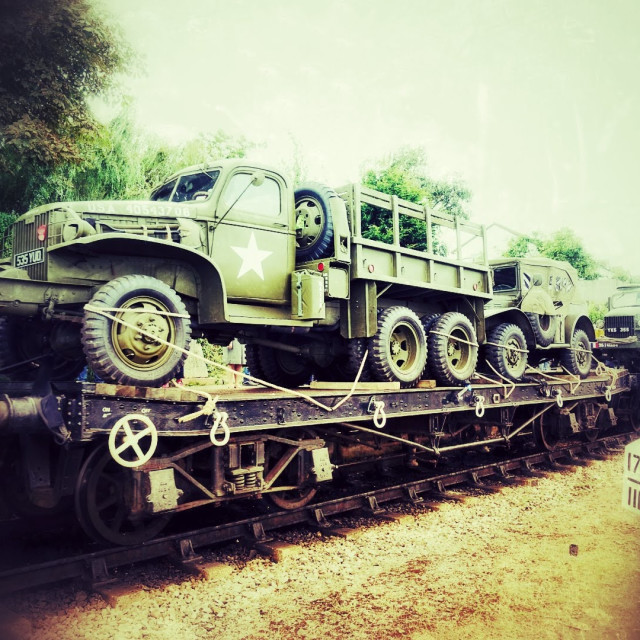 A vintage military truck is parked on a train track, with a vintage train car behind it. The truck is green with a star decal on the side and is loaded with various military equipment. The train car is also green and has a similar design to the truck. The scene has a vintage, sepia-toned appearance, giving it an old-fashioned feel. | "West Somerset Railway 1940s event" stock image | 27acec25c54093d0e01588d2ded3f134bf0478229eff5885b06a1554fefc6106 | 000720957493 | 0 | 0 | 61 | 7 | 0 | 0 | |