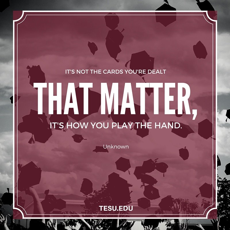The second image is a close-up of a graduation cap with the phrase 'It's not the cards you're dealt, that matter, it's how you play the hand.' written on it. The cap is red with a white border and the text is in a white font. The background is a blurred image of a graduation ceremony with more caps and a crowd of people. The image is framed with a decorative border that matches the first image. | Thomas Edison State University On Twitter Its Not The Cards You | be74d24b6ac57575f1d636554a981e83a43792752dac22ac0607c249cf0742ca | 000720958353 | 0 | 0 | 77 | 11 | 0 | 0 | |