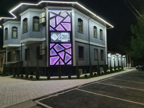A modern building with a neon sign that reads 'SOHIL' in purple and pink neon lights. The building has a flat roof with a series of vertical lights running along the edge. There are two air conditioning units on the roof. The building is illuminated with a combination of neon lights and white lights, giving it a contemporary look. The surrounding area is dark, suggesting it is nighttime. There are trees and a car parked in the distance. | Grand SOHIL Hotel, Tashkent City | 22f9be25bd7080903c3d32e89b34849daa3e04e1046108e82c5cd5416cac22e7 | 000720958399 | 0 | 0 | 78 | 5 | 0 | 0 | |