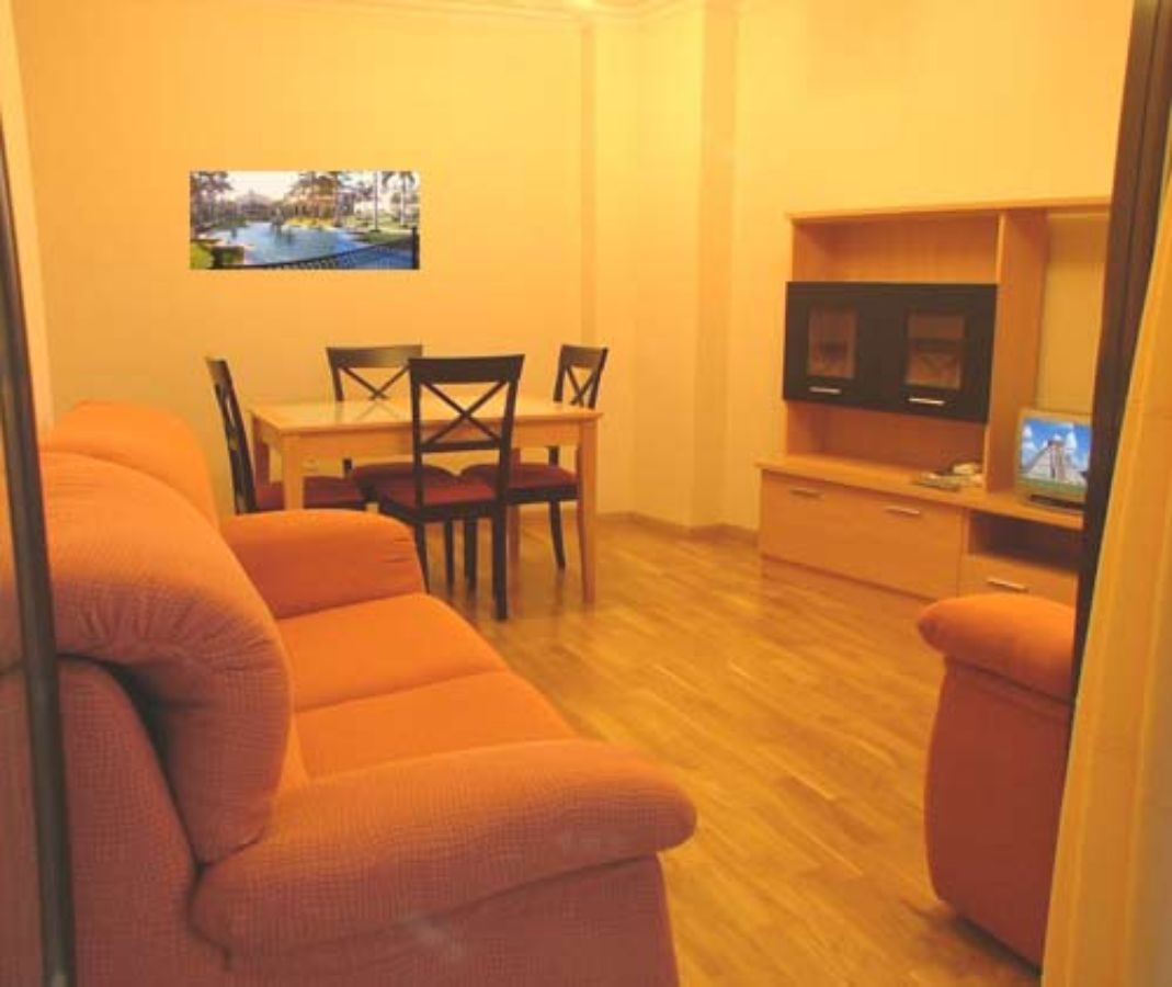 A cozy living room with a large window, a comfortable orange couch, a wooden dining table with four chairs, and a flat-screen TV on a wooden entertainment unit. The room has wooden flooring and a framed picture of a pool on the wall. | For rent of flat in Salamanca | 6abeeb35d281389c05cf245106925f6e99e3e61ea9cc3db3929684a367a3f449 | 000720958344 | 0 | 0 | 43 | 6 | 0 | 0 | |