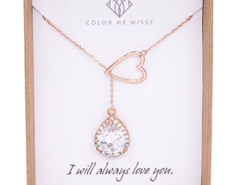 A heart-shaped pendant with a diamond in the center, suspended from a chain, is displayed in a wooden box with a white background. The box has a tag that reads 'COLOR ME MISSY' and the phrase 'I WILL ALWAYS LOVE YOU.' is written below the pendant. | Rose Gold Luxe Cubic Zirconia Teardrop and Heart Lariat, Y Necklace, Forever Anchored, sister, best friends, mom, bridal bridesmaid | d31ec6064bb88a608192b0357b458ab1f59ed572bdcc2466a0d6f4597a607cbb | 000720925448 | 0 | 0 | 46 | 19 | 0 | 0 | |
