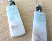 A pair of earrings made from white and green marble with visible veins and a textured surface. The earrings are attached to a silver earring hook and are displayed on a wooden surface. | Blue Amazonite Earrings, Wearable Art, Semi-Precious Stone of Courage | 0e295e9fc068fd67397086c60f582f35898de4552bce3f0e29e45f9029673faa | 000720925296 | 0 | 0 | 33 | 9 | 0 | 0 | |