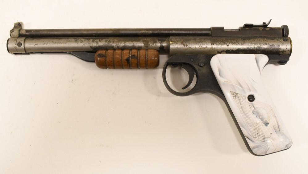 A close-up image of a vintage revolver with a wooden grip and a metal barrel. The revolver has a trigger guard and a trigger, and the barrel is attached to the frame with a screw. The image is in black and white, and the revolver is set against a plain white background. | Benjamin Franklin 132 .22 Cal Pump Air Pistol | e939a25ffdb4ff96a6f21691b5721e54b4420b7d2e44692d1bd3180f599e9168 | 000720925437 | 0 | 0 | 52 | 8 | 0 | 0 | |