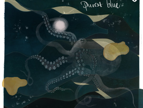 The second image is a stylized illustration of an octopus underwater. The octopus is depicted with a dark blue and black color scheme, with its tentacles spread out in a dynamic pose. The background features a dark blue ocean with waves and bubbles, and there are several small yellow objects floating in the water. The text 'PURSE BLUE' is written at the top of the image, and the overall style is reminiscent of a vintage poster or print. | Review: Emotional TY - Purest Blue EP [EMTY] | b0dad27c857992e42b150613decb6e3fb850f56f5effeedff829e530bb3d38b0 | 000720925090 | 0 | 0 | 78 | 8 | 0 | 0 | |
