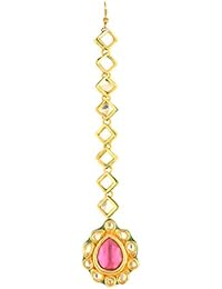 A close-up image of a gold earring with a large, round, pink gemstone at the bottom, surrounded by intricate gold detailing. The earring has a series of smaller, square-shaped gold elements connected by thin gold bars, creating a chain-like effect. The earring is set against a white background. | Dilan Jewels PURE Collection Pink Colour Gold Plated Kundan Mang Tika For Women | b10d0bd5243ab61af5215a32b127e91f09a51992d4e7ecad0d18a08e5ca5a2fa | 000720958715 | 0 | 0 | 48 | 13 | 0 | 0 | |