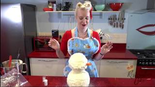 A woman in a red apron and blue dress is standing in a kitchen with a red countertop. She is holding a white, fluffy object that resembles a snowman. The kitchen has a red refrigerator, a stove, and various kitchen utensils hanging on the wall. There is a bowl on the countertop and a bottle of liquid next to the woman. | Christmas Snowman Cake Decorating with Charlotte White | 937f2bb32616e1e28f3c27c4f655d088eefba03a9efd278b272c0d86034aa5e6 | 000720958763 | 0 | 0 | 61 | 7 | 0 | 0 | |