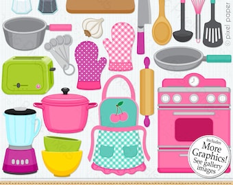A collection of kitchen items is displayed in a grid pattern. The items include a toaster, a blender, a coffee maker, a kettle, a frying pan, a pot, a whisk, a spatula, a rolling pin, a whisk, a ladle, a measuring cup, a mixing bowl, a cutting board, a knife, a fork, a spoon, a pair of scissors, a pair of tongs, a pair of oven mitts, a tea infuser, a tea pot, a teacup, a sugar bowl, a creamer, a milk jug, a coffee cup, a coffee mug, a plate | Clip Art Cute Kitchen - Cooking Clipart - Personal and commercial use | 8f29e3836deac83cce0c22c0b9a339fa9a26ad017ec229966feeda468ed42db9 | 000720958645 | 0 | 0 | 91 | 12 | 0 | 0 | |