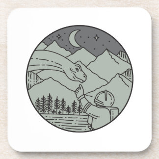 A circular illustration featuring a mountainous landscape with a large, stylized dragon flying above the mountains. The dragon is depicted in a monochromatic color scheme, with a gradient from light to dark gray. Below the dragon, a figure in a space suit is reaching out towards it, also in grayscale. The background includes a night sky with a crescent moon and stars. The entire image is framed by a thin, light-colored border. | Astronaut Touching Brontosaurus Circle Mono Line Coaster | c4e85ef6a0ae35602c6ecc086371fae498cacb288d4f691104cab7c8877cb77e | 000720958614 | 0 | 0 | 72 | 7 | 0 | 0 | |