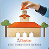 The second image is a stylized illustration of a church with a prominent steeple and a large, arched entrance. The church is depicted with a wooden texture and is set against a blue background. A hand is shown holding a red roof tile, suggesting the act of placing it on the church. The image is titled '2018 Community Report' and includes the text 'Clayton Community Report' at the bottom. | Community Report 2015 | d56c3c1006d85c80b0114162ef960ac96c6751b731b9cebceaacfe25fc5a44ac | 000720959057 | 0 | 0 | 69 | 3 | 0 | 0 | |
