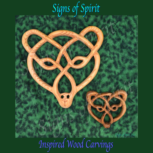 A wooden Celtic knot design with a heart shape in the center, surrounded by intricate patterns. The design is placed on a green surface with a pattern that resembles leaves. Below the main design, there is a smaller wooden Celtic knot with a heart shape in the center, also surrounded by intricate patterns. The smaller design is placed on a green surface with a pattern that resembles leaves. The image has a title at the top that reads 'SIGNS OF SPIRIT' in a decorative font, and a subtitle at the bottom that reads 'INSPIRED WOOD CARVINGS' in a smaller font. | Celtic Bear Knots by Signs of Spirit | fbf7f9b38d617d564f137f4430e6dcc12e201a3cef09eebd11e2805175d45cae | 000720959097 | 0 | 0 | 100 | 7 | 0 | 0 | |