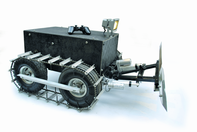 A small, remote-controlled robot with a black body and a flat, square base is equipped with two large, black wheels and a set of sharp, metal spikes on its front. The robot has a small, circular, metallic object attached to its side and a pair of black, rectangular controllers resting on top of its body. | Here comes the open source Snow Plow Robot | Open Electronics | 9bd89fea27c00cecf069a61fce784d0b9094388c23b46b048d73e7801a0b654f | 000720958959 | 0 | 0 | 55 | 11 | 0 | 0 | |