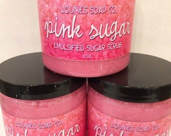 Three jars of pink sugar scrub from Louies Soap Co. are stacked on top of each other. The jars have a black lid and are filled with a pink sugar scrub. The label on the jars reads 'PINK SUGAR' and 'EMULSIFIED SUGAR SCRUB'. The jars are placed on a surface with a white background. | Pink Sugar Sugar Scrub | 40dd7ba8c402e91d770f6fac584f10c9a0412282cccc1d4a55e5a18212646dfe | 000720959026 | 0 | 0 | 54 | 4 | 0 | 0 | |
