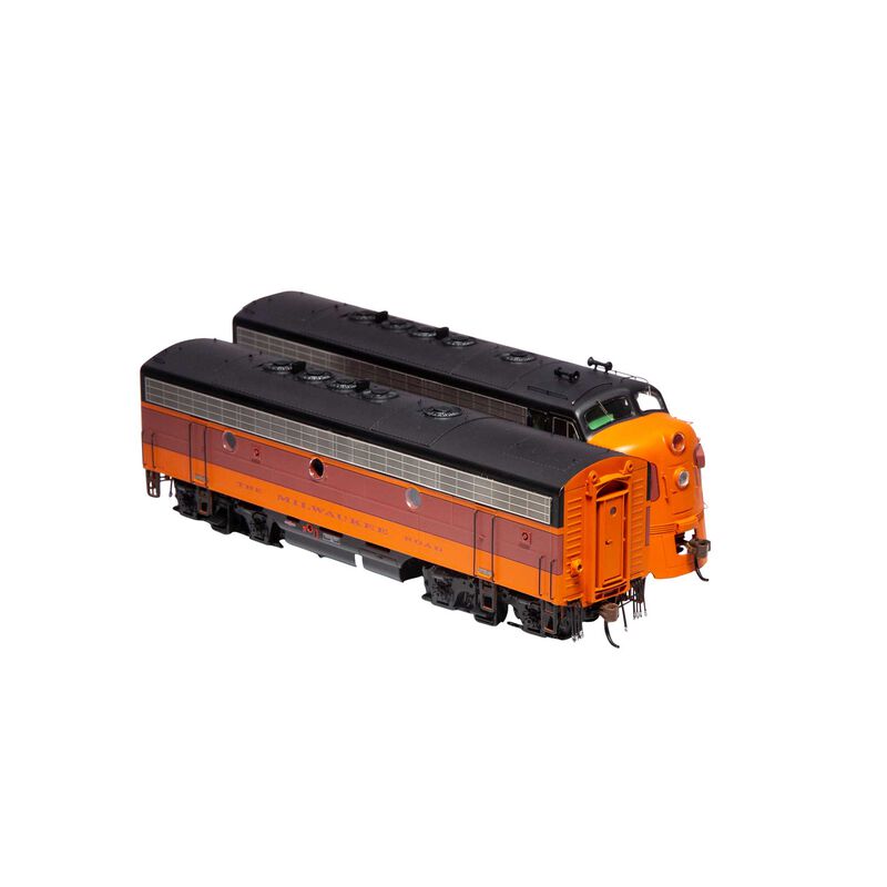 A model train with a black and orange color scheme is displayed on a white background. The train has a black roof and a series of windows along its sides. The front of the train features a headlight and a number '1' on the front right side. The train appears to be a diesel locomotive with a long body and two sets of wheels. | HO F7 A B with DCC & Sound MILW #69A/#69B | a4faf6bb9a0c7b3dcb3fba9037fbbc3fbf74805781750f4d24177d8877ab57a0 | 000720959050 | 0 | 0 | 64 | 10 | 0 | 0 | |
