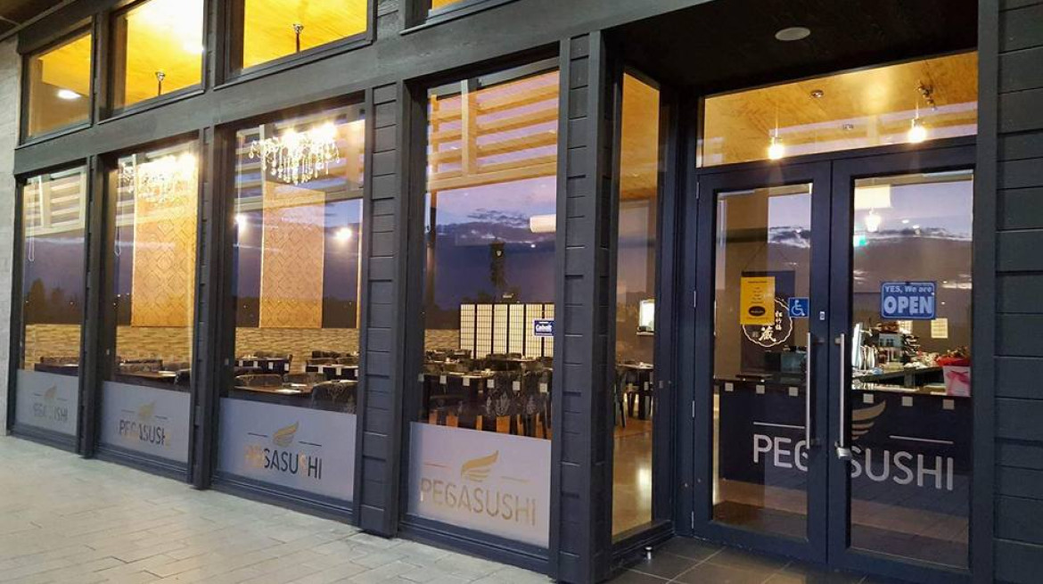 The first image shows the exterior of a sushi restaurant at night. The building has a modern design with large glass windows that reveal the interior, which includes a sushi bar and dining tables. The windows are adorned with decorative elements and the restaurant's name, 'Sushi Pequos'. The exterior is illuminated by warm lighting, and the sky is visible through the glass, showing a twilight ambiance. | pegasushi exterior | 373b2af61511b75d638ec830071505dbe432fb3e413f2857d9d4c41892fcebc7 | 000720959292 | 0 | 0 | 66 | 2 | 0 | 0 | |