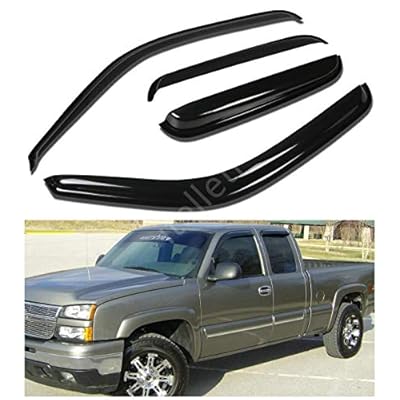 A black plastic truck bed cover is shown in a close-up view, with a detailed illustration of the truck's front and side profile in the background. The truck is depicted in a realistic style, with a focus on the front grille, headlights, and side mirrors. The background is a plain, light-colored surface, and the image is devoid of any other objects or distractions. | itelleti 4pcs Outside Mount Dark Smoke Sun/Rain Guard Front+Rear Tape-On Auto Window Visors For 99-06 Chevy Silverado/GMC Sierra 07 Classic Body 1500/2500/3500 HD Extended Cab With Half Size Rear Door: Automotive | 654f7b66c7bbb7a43efb816ee03e9fa54e73a3524fab1aec1d465eee81cdebac | 000720959395 | 0 | 0 | 63 | 31 | 0 | 0 | |