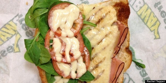 A sandwich with a tomato slice on top, covered in melted cheese, is placed on a paper wrapper. The sandwich is cut in half, revealing the chicken inside. There are red tomato slices and green lettuce leaves visible on the bottom half of the sandwich. The wrapper has a logo and text that reads 'SUBWAY'. | Subway's 'Secret Menu' Revealed By Executive Chef Chris Martone (PHOTOS) | HuffPost Life | 1ab93cff5c357d50b2a71dc699d46a96b4dd4101222d4b1906651d66bce6c279 | 000720959788 | 0 | 0 | 55 | 13 | 0 | 0 | |
