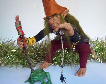 A detailed miniature figurine of a troll with a pointed hat and a menacing expression is holding a sword and a shield, standing next to a small green frog figurine. The troll is adorned with a necklace and a bracelet, and is positioned on a surface with a backdrop of tinsel and a white background. | Folgor, Goblin Hunter frogs / art Ooak doll lucky leprechaun / doll and pet / | c912c002f5a8ecb09f388aee692d001d17834191630552e2db5d7fd30488e7eb | 000720959675 | 0 | 0 | 55 | 15 | 0 | 0 | |