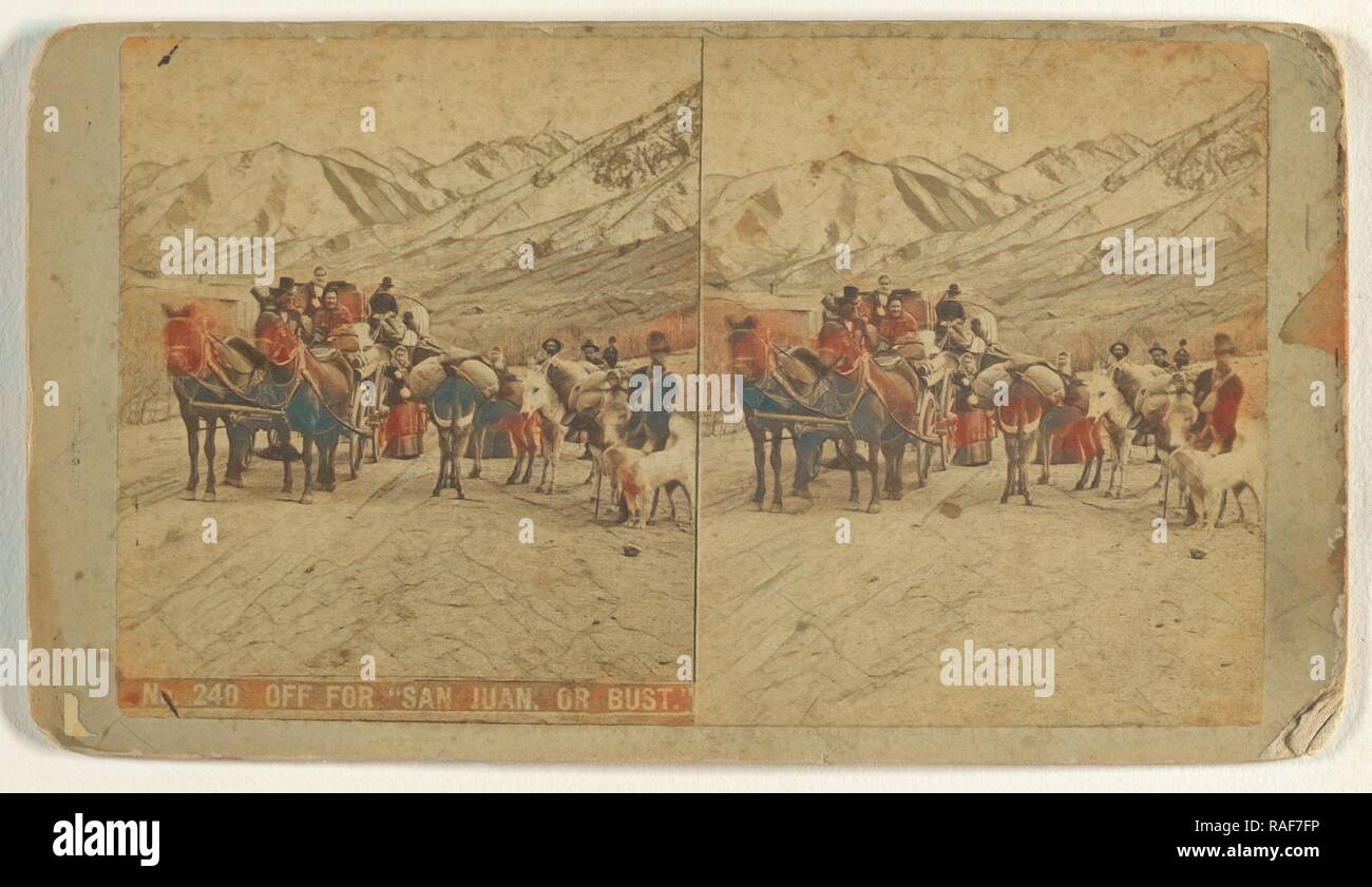 A vintage photograph of a group of people riding horses in a mountainous landscape. The image is in a split diptych format with a white border around it. The top half of the diptych shows a group of people riding horses on a dirt path, with mountains in the background. The bottom half shows the same scene with a different group of people riding horses, also on a dirt path with mountains in the background. The photograph has a sepia tone and appears to be aged, with visible wear and tear. The image is labeled with 'ALAMY' and 'IMAGE ID: 12345678' at the bottom. | Off for San Juan, or Bust., Charles Weitfle (American, 1836 - after 1884), about 1880, Albumen silver print reimagined - Stock Image | 890e3ee26e00d82220b3b895505773fbcbf684f0f8421ced1ec8eabc72864a1a | 000720925598 | 0 | 0 | 104 | 22 | 0 | 0 | |