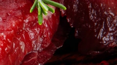 A close-up of a piece of meat with a red, juicy texture, featuring a cut revealing the meat's interior. A sprig of green herbs is placed on top of the meat, adding a pop of color to the image. The lighting is dramatic, highlighting the meat's texture and the herbs' freshness. | Raw beef fillet mignon on old retro style wood Stock Footage | bf258baffd653e3ad189ca1293c662fc775671a12132f703606cf4407f47b26b | 000720930021 | 0 | 0 | 51 | 11 | 0 | 0 | |