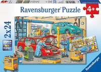 The first image shows a puzzle box with a title that reads 'RAVENSBURGER PUZZLE 2+4'. The puzzle is divided into two sections, with the left section labeled '2' and the right section labeled '4'. The puzzle depicts a garage scene with various vehicles, including a red car with its hood open, a green car on a lift, and a blue car on the floor. There are multiple people in the scene, including a mechanic working on the red car, a person standing next to the green car, and another person near the blue car. There are also tools and equipment scattered around the garage | Ravensburger At the Service Station Puzzle (2 x 24pc) | 50dfb38591f8e6a88b99b624f12896b71ba71458b10005a220cc5c34c1f49b45 | 000720930074 | 0 | 0 | 104 | 9 | 0 | 0 | |