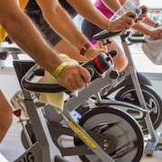 A group of people are exercising on stationary bikes in a gym. The bikes are equipped with water bottles attached to the handlebars. The individuals are wearing wristbands and appear to be in the middle of a workout. The gym has a modern design with large windows allowing natural light to enter. | Fitness Facility | acbaea2ca5f0b4bc3457368b68cc1402f233818d3284e46786c9ae77c74437c5 | 000720930003 | 0 | 0 | 52 | 2 | 0 | 0 | |
