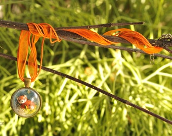 A small, round, glass ornament with a red and white pattern hangs from a thin branch. The branch is part of a larger tree branch that is adorned with a long, orange ribbon. The scene is set against a backdrop of green foliage, creating a natural and serene atmosphere. | Red Animal Panda necklace in glass dome pendant | 16a60aab807e2b8d2a4296bb1fb06701b7bf8cecef79093d41cf2a1099594471 | 000720925565 | 0 | 0 | 49 | 8 | 0 | 0 | |