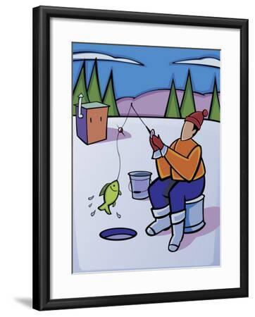 A framed picture of a person in an orange jacket and blue pants sitting on a blue cooler, fishing in a snowy landscape with a green fish on the line, a blue bucket, and a wooden shed in the background. | Man Ice Fishing on Frozen Lake--Framed Photo | 325643f339e783a2cbce28ac25a0a7cc21153a7b54fa1f0ccdbb1977050f6e17 | 000720930110 | 0 | 0 | 40 | 7 | 0 | 0 | |