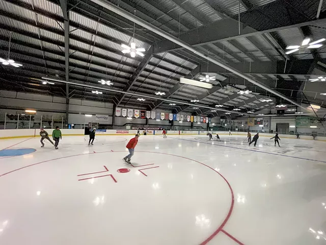 The first image shows an indoor ice rink with several people ice skating. The rink is surrounded by a high ceiling with exposed beams and a series of lights hanging from the ceiling. The ice surface is marked with white lines and a red 'X' in the center. There are multiple flags hanging from the ceiling, and the walls are adorned with various banners. The skaters are wearing a mix of casual and athletic clothing, and the overall atmosphere appears to be that of a public ice skating session. | Ice rink at Union Arena Community Center - KEN PICARD \xc2\xa9\xef\xb8\x8f SEVEN DAYS | 483da32c04f6a2ca59b7d679f7ab209644695db912b582231db85f8746a0b320 | 000720925573 | 0 | 0 | 89 | 13 | 0 | 0 | |