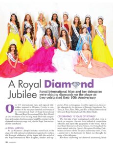 The first image is a magazine cover featuring a group of women dressed in various colorful gowns, all wearing tiaras and sashes. The title reads 'A Royal Diamond: Royal International Miss and her delegates were shining diamonds on the stage at their 10th anniversary' with a subtitle 'O, on the 27th of July, 2017, the 10th anniversary of the Royal International Miss and her delegates were celebrated with a grand ceremony'. The image is overlaid with text and graphics, including a section titled 'A Royal Diamond Jubilee' and a smaller section with the text 'O, on the 27th | royal international miss, rim pageant, pageant, national pageant | 6726ba8a778b1236e121fdb2691fd047565dc5807ec127d27c2b6aef56a23ecc | 000720925541 | 0 | 0 | 98 | 8 | 0 | 0 | |