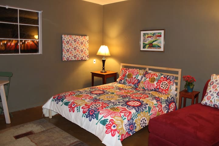 A cozy bedroom with a large bed covered in a colorful floral bedspread. The bed is adorned with multiple pillows, some of which have a similar floral pattern. A wooden nightstand with a lamp is placed beside the bed, and a framed picture hangs on the wall above it. Another framed picture is visible on the opposite wall. The room has a warm ambiance with a beige wall color and a dark wooden floor. A red armchair with a matching floral pattern is situated in the corner of the room, and a small table with a vase of flowers is placed next to it. | Two-Bedroom UrbanFarm Guest House, Central Phoenix | 8c7b8618976061e1a54cbfea60b7f4992ea6c3d6a2b4599acf64d13538fe8296 | 000720960992 | 0 | 0 | 104 | 6 | 0 | 0 | |