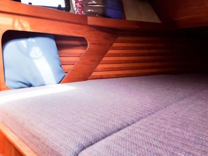A blue cushion is placed on a wooden bench inside a boat. The cushion is partially covered by a blue blanket, and there is a wooden panel with a window behind it. The bench is situated in a cabin area with wooden walls and a wooden floor. | 1982 Sceptre 41 Pilothouse Sloop Photo 53 of 59 | 3c64c35c9817a0ef5568a779336fab88c099bc96a475e61fa861feff4496cdd1 | 000720961174 | 0 | 0 | 47 | 9 | 0 | 0 | |
