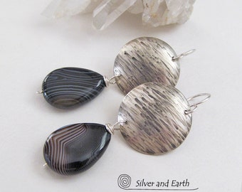 A pair of silver earrings with a textured wood grain design is displayed against a white background. The earrings are positioned vertically, with one on the left side and the other on the right side of the image. The background features a subtle sparkle effect, and there is a small, delicate crystal-like object to the left of the earrings. | Banded Agate Earrings, Sterling Silver Earrings, Handmade Artisan Modern Silver Metalwork Jewelry Black Gemstone Earrings Everyday Jewelry | 10f17b4d987eeb75726b02d7f702866fbe6041db5055bccde823fb3c4ce7e21b | 000720960788 | 0 | 0 | 59 | 17 | 0 | 0 | |