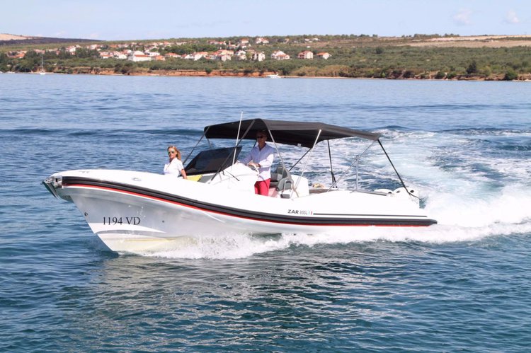 A white and black speedboat with a black canopy is speeding across the water. There are two people on board, a man and a woman, both wearing white shirts. The man is standing at the front of the boat, while the woman is standing near the middle. The boat has the registration number 'F-1144' visible on the side. The water is calm, and the background features a clear sky and a shoreline with houses and trees. | Boat for rent ZAR FORMENTI SRL 27.0 feet in Marina Kornati, Biograd, Croatia | 4ab5fc70364ef32fabd82f6bf6d85377579c3f3f43761a3759d32d26391074c8 | 000720961189 | 0 | 0 | 76 | 13 | 0 | 0 | |