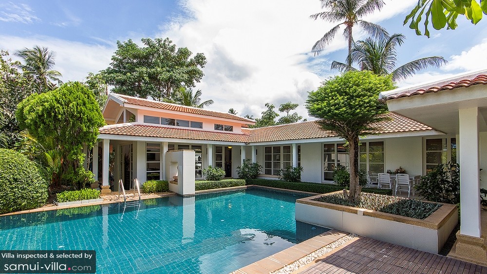 A modern house with a swimming pool in the backyard, surrounded by lush greenery and palm trees. The house has a tiled roof and white walls, with a large window on the right side. The pool is blue and rectangular, with a wooden deck around it. There are several chairs and a dining table set up near the pool area. The sky is partly cloudy, and the overall atmosphere is serene and tropical. | Villa Baan Arun | f20b41135adfdb8a6eee51a42eea57c2b6076b68768a7de864950e553e8a9b30 | 000720961863 | 0 | 0 | 73 | 3 | 0 | 0 | |